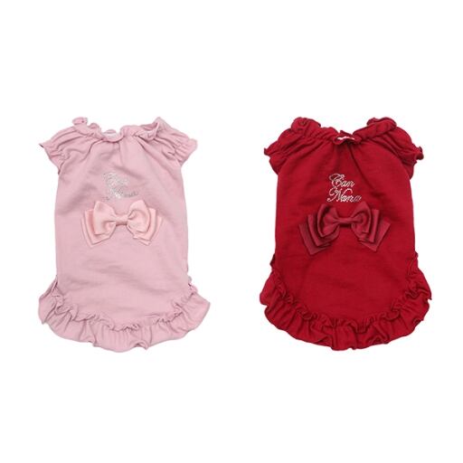 シックな秋色のコットン素材に、大きえリボンを添えて、大人かわいいシンプルワンピースに。首、袖、お腹にゴムが入っているので、着心地がよく、着脱が快適です。ラインストーンロゴのキラキラ感にも気分があがります。