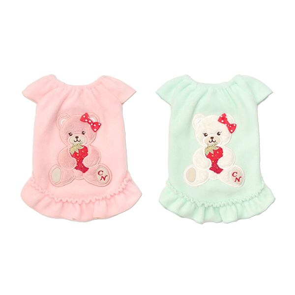 いちごを抱きしめているきゃんくまちゃんが目を引く、ガーリーなフリースワンピース。