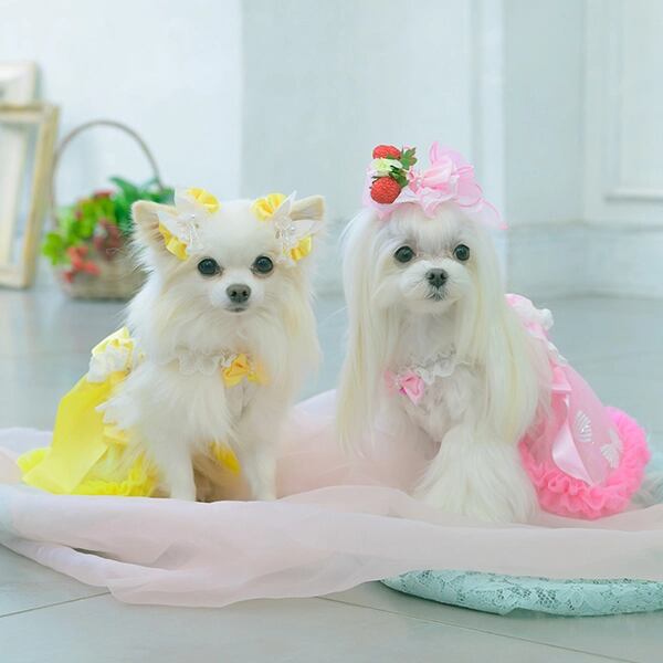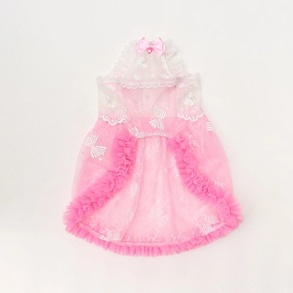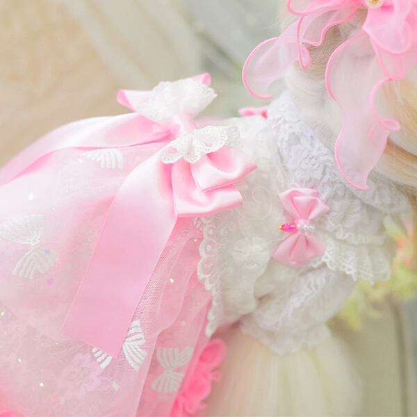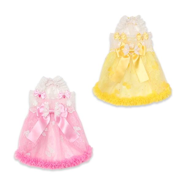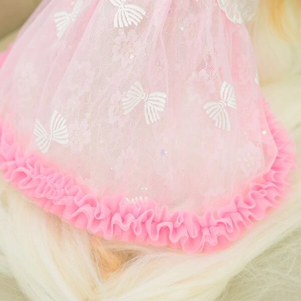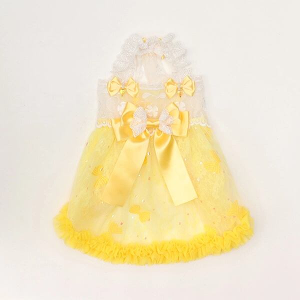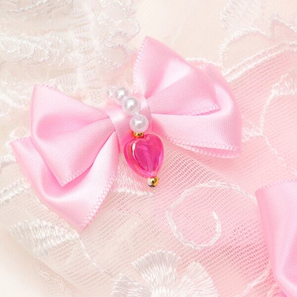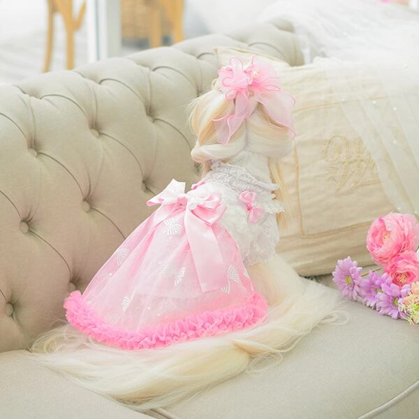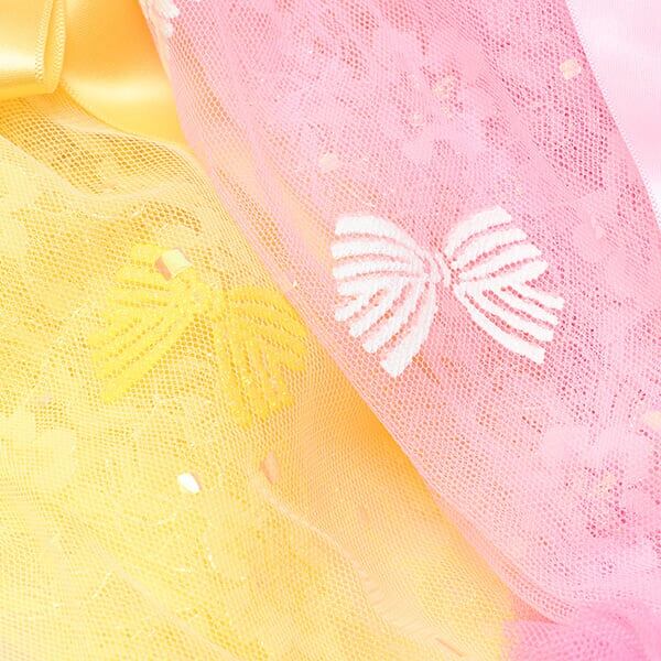 全て透け感ある素材でアレンジしたハイウエストのキャミワンピース。春風になびくスカートフリルは、エレガントな雰囲気で、加えてラメやスパンコールが光に反射して美しくきらめきます。胸元や肩のサテンリボンにはハートやビーズでアクセントをつけています。肩紐は、伸縮性があるので着脱時、動きに柔軟です。ウエストのリボンは、ピンブローチになっており、様々なアレンジをお楽しみいただけます。