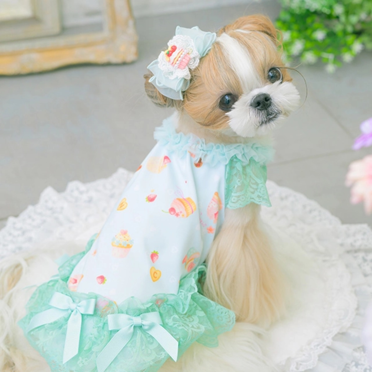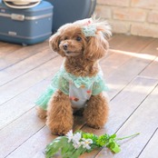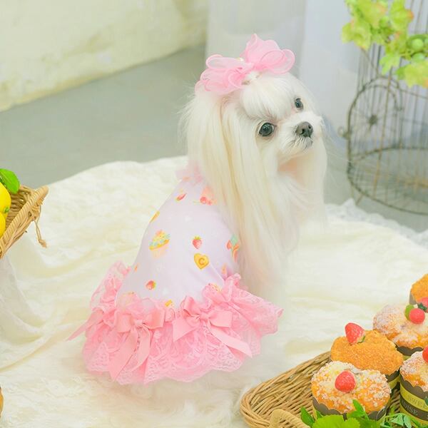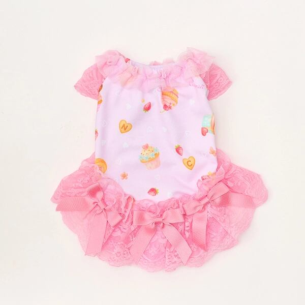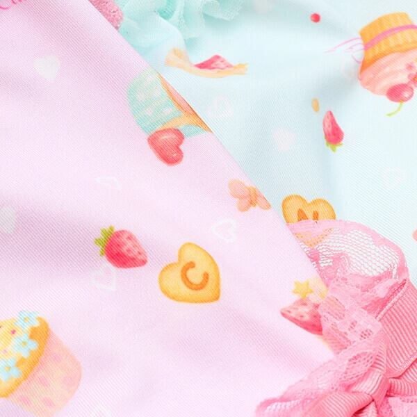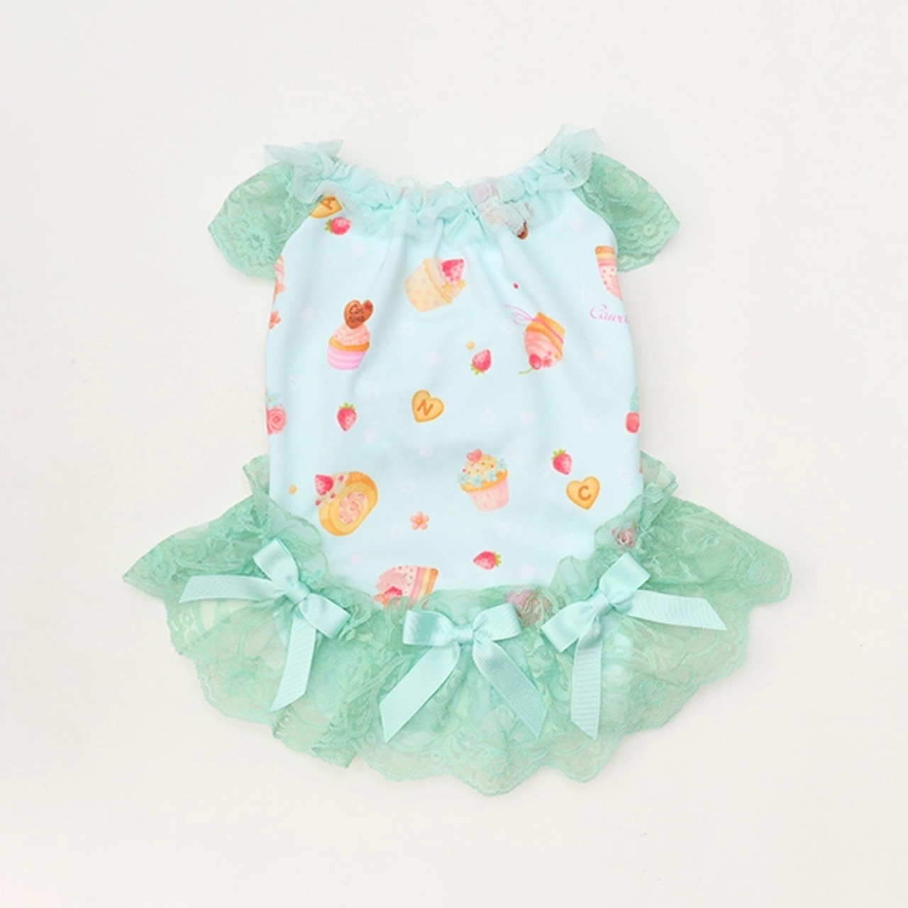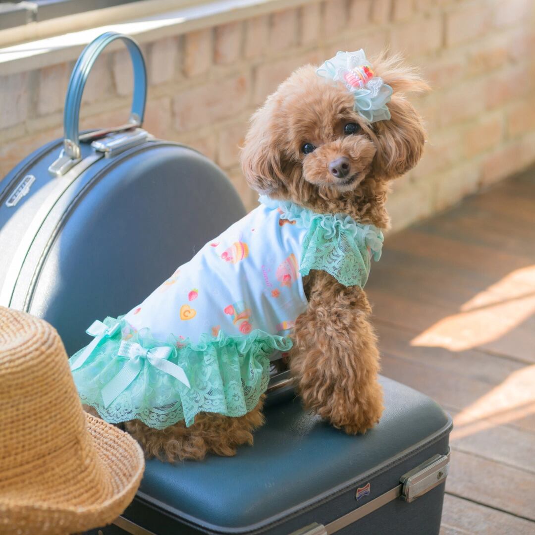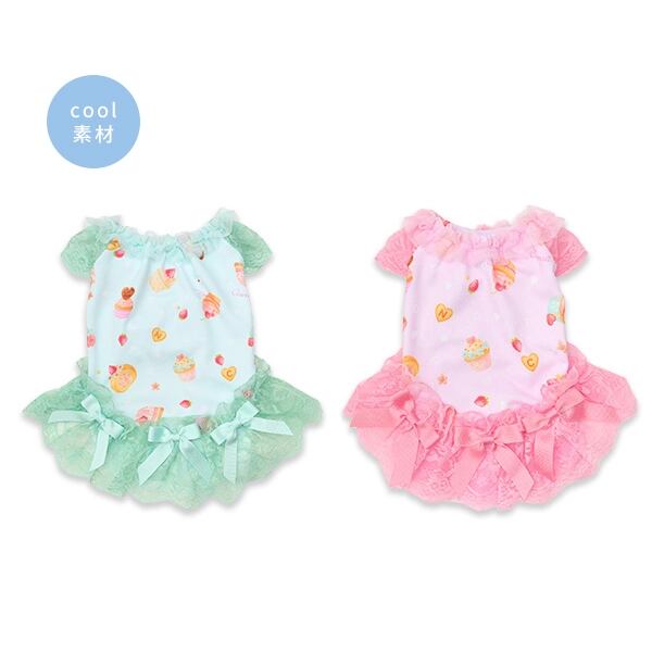 パステルカラーのcool素材に、たっぷりスイーツをちりばめてラブリーに仕上げてワンピース。涼やかさを併せ持つ素材に加えて、袖や裾のレース、首元のチュールフリルでも見た目の清涼感を演出します。